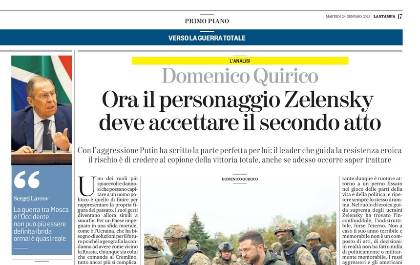 Sulla Stampa Domenico Quirico scrive che "Zelensky di prima del 24 febbraio, prima della invasione russa, era un attore, e soprattutto un leader, scialbo, alla ricerca di un copione giusto, di una maschera di cartone che lo sollevasse dalla mediocrità di una recita senza profumo. [...] È Putin che ha scritto sciaguratamente, con l’aggressione, la parte perfetta per lui, quella che non avrebbe mai immaginato da solo: il leader che guida la resistenza eroica di un popolo intero contro una prepotenza condotta con metodo stalinista e brutale, spregiudicato, combattivo, una forza della natura nel suo vitalismo di piccola belva. Tanto da far sembrare, al confronto, il nemico, lo zar, un mediocre addetto impiegatizio del Male. Zelensky ha recitato la parte con efficacia in questo imbrogliato scorcio del terzo millennio che sembra recedere alla più selvaggia preistoria: le passeggiate nella Kiev deserta e spettrale dei primi mesi a fianco dei leader occidentali, o al fronte tra le macerie riconquistate, i discorsi serali alla nazione, in perenne costume guerresco, la maglietta verdognola che allude a iconologie mistico consumistiche alla Guevara, gli interventi continui, incalzanti, assertivi via video per non dar scampo ad alleati tiepidi o riluttanti". E poi: "Il rischio per Zelensky è di cominciare a credere al copione che finora ha recitato, di persistere, come accade al protagonista dell’Enrico IV, nella parte che ha recitato, anche se sa che è finzione, non corrisponde più alla realtà. Costringendo gli altri a uniformarsi. Ciò significa credere che la vittoria totale contro la Russia, la eliminazione diretta o indiretta di Putin, sia l’unica opzione possibile. E che invece non sia arrivato il tempo del secondo atto". Ossia la pace. Ma può esserci così una pace davvero definitiva? Una pace che sarebbe davvero un messaggio a tutti gli altri despoti in cerca di espansione territoriale?