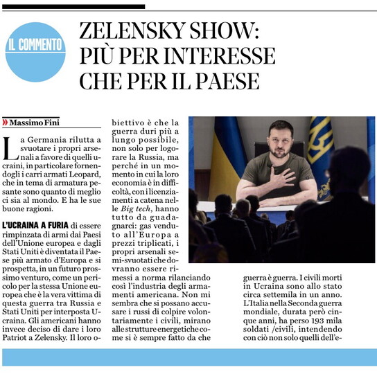 Quella di Quirico è una posizione molto simile a quella di Massimo Fini che sul Fatto quotidiano espone - dopo aver dato la colpa agli americani per la guerra in Ucraina - i suoi argomenti. Sarebbe Zelensky a voler continuare le ostilità, a non volere la pace: "L’arroganza, insieme a un’innata volgarità, di Volodymyr Zelensky sta superando ogni limite. In video-conferenza con Davos, noto covo di benefattori dell’umanità, ha affermato: “Non è sicuro che Vladimir Putin sia ancora vivo, potrebbe essere una sua controfigura quello che compare sugli schermi”. Non mi pare che Vladimir Putin si sia mai espresso in termini così sprezzanti nei confronti del presidente ucraino. Anzi, segnali di apertura alle trattative sono venuti proprio da Putin e non da Zelensky che ha disposto per legge che con la Russia di Putin non si può trattare".