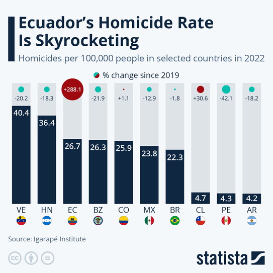 Il grafico che pubblichiamo qui sopra, realizzato da Statista, cerca di dare un’idea di dove si colloca l’Ecuador nel contesto dei suoi vicini latinoamericani. Il tasso di omicidi del Venezuela è stato il più alto della regione nel 2022 con 40,4 persone uccise ogni 100.000 abitanti, anche se con un calo del 20 per cento rispetto al 2019, quando il tasso era di 50,6 omicidi ogni 100.000 persone. Molti paesi dell’America Latina hanno registrato diminuzioni degli assassinii tra il 2019 e il 2022. Con la triste eccezione dell’Ecuador, dove invece sono aumentati di un impressionante 288 per cento: da 6,9 morti per 100.000 abitanti nel 2019 fino a 26,7 morti per 100.000 nel 2022.