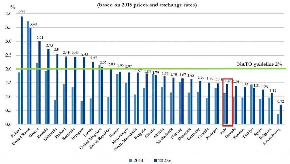 Le Forze Armate italiane, si legge sempre nello studio della Camera, partecipano attualmente a nove missioni della Nato, con una presenza massima autorizzata dal Parlamento di 5.200 unità e un finanziamento di 463,5 milioni di euro. Un contributo esiguo se si considera che secondo il rapporto della Nato Defence Expenditure of NATO Countries (2014-2023) l'Italia si colloca alla ventiquattresima posizione, seguita da Canada, Slovenia, Turchia, Spagna, Belgio e Lussemburgo. Degli altri ventitrè stati membri, undici –Polonia, Stati Uniti, Grecia, Estonia, Lituania, Finlandia, Romania, Ungheria, Lettonia, Regno Unito e Slovacchia – superano la soglia del 2 per cento e risultano quindi in linea con l'obiettivo fissato al summit Nato del 2014. Come se non bastasse, a dimostrare la sterilità della polemica sulle spese militari italiane, più volte innescata dall'opposizione (con i Cinque stelle in prima fila) il Documento programmatico pluriennale della Difesa per il triennio 2023-2025 ha previsto il raggiungimento della percentuale Nato nel 2028, cioè tra cinque anni.