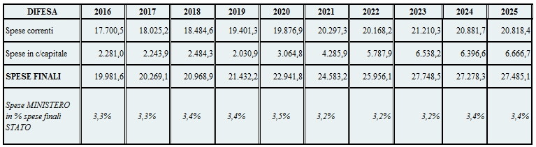 Secondo uno studio della Camera dei deputati, il rapporto tra spesa militare e pil in Italia è sempre oscillato tra l'1,14 per cento del 2014 e l'1,59 del 2020, la percentuale più alta raggiunta negli ultimi dieci anni. Dal 2021 in poi, infatti, la fetta di prodotto interno lordo destinata alla Difesa del nostro paese ha subito un lieve ma progressivo calo fino a raggiungere la quota dell'1,46 per cento nel 2023. In termini assoluti si tratta di circa 2,7 miliardi di euro, una cifra che negli ultimi anni è sempre cresciuta.