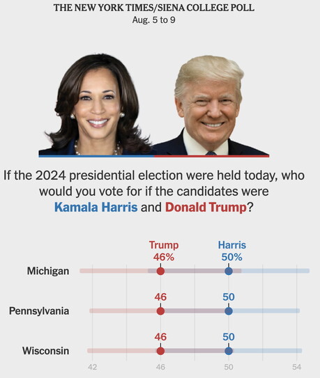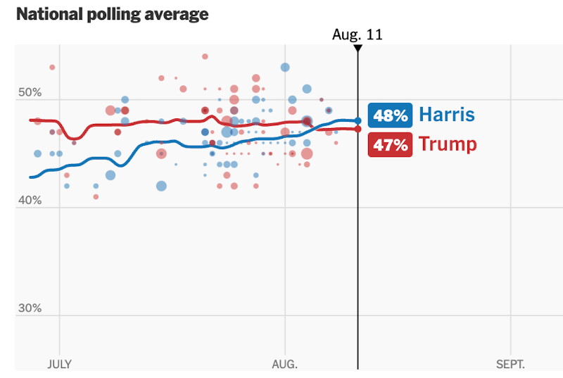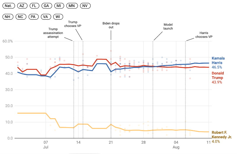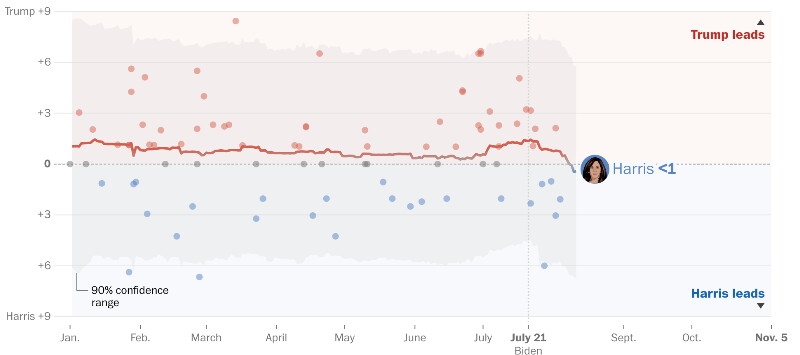 Il Silver Bulletin del sondaggista Nate Silver indica Harris addirittura in una situazione di decollo, con un margine di distacco da Trump che si allarga di giorno in giorno e che aumenterà almeno fino alla fine della convention.