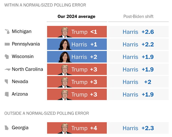 Se si va a vedere la situazione dei sondaggi nei singoli stati, arriva la conferma che non solo gli stati in bilico sono passati da sei a sette (Harris ha rimesso in discussione la North Carolina, che sembrava destinata a una facile vittoria repubblicana), ma che in alcuni la candidata democratica è passata a condurre e in tutti o quasi le differenze sono ora nell’ordine del margine di errore.