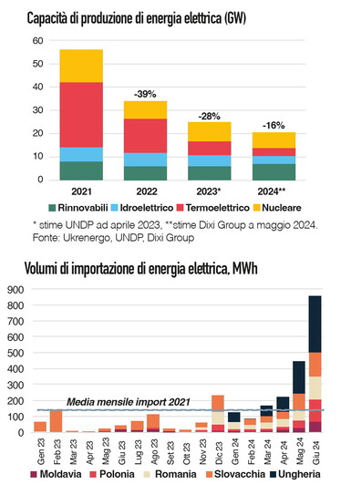 Da marzo 2022, la rete elettrica ucraina è stata collegata alla rete dell'Ue, il che consente a Kyiv di ricevere supporto dagli stati confinanti. La disconnessione dell'Ucraina dal sistema elettrico russo e il collegamento con l'Europa continentale sono state rese permanenti a novembre 2023 e gli operatori di sistema europei hanno deciso di aumentare il limite di capacità per le importazioni di elettricità. Ciò ha consentito finora a Ukrenergo, l'operatore ucraino, di assorbire meglio gli shock al sistema, dovuti agli attacchi o a picchi di consumo causati dalle temperature più fredde dell'inverno in arrivo. Dopo il primo massiccio attacco dello scorso marzo, Kyiv ha interrotto le sue esportazioni di elettricità e ha iniziato a importarne. Da maggio il volume dell'import si è spesso avvicinato al limite massimo di capacità anche di notte: significa che l'Ucraina non è più in grado di soddisfare la sua domanda, nemmeno nel periodo di minor consumo. Le importazioni record dai paesi limitrofi e il bel tempo, che ha permesso al paese di produrre più energia da rinnovabili, hanno per ora stabilizzato la situazione. Spesso però l'import ha già raggiunto il tetto massimo (1,7 GW) e non è detto che i paesi vicini avranno a disposizione surplus energetici così grandi, soprattutto nei mesi freddi. Inoltre le importazioni non possono rifornire le oblast più orientali, come Kharkiv e Dnipropetrovsk. Il quadro peggiorerà poi quando le centrali nucleari inizieranno a chiudere unità per la manutenzione stagionale programmata (con un deficit di potenza previsto di circa 3 GW) e con l'arrivo dell'inverno, che potrebbe essere il più duro per i cittadini ucraini. Kyiv potrebbe arginare il problema decentralizzando la produzione. Si tratterebbe di installare un gran numero di piccole centrali elettriche a gas e generatori da pochi megawatt, in grado di cogenerare sia elettricità sia calore. Riuscirà finanziare e gestire un simile modello su larga scala in pochi mesi?