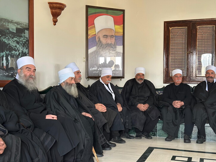 The group moves into the hall reserved for audiences. Alongside village representatives are members of Suwayda's main militia, Faz’at Shabab al-Jabal, who express their gratitude for the chance to speak with Hijri directly. The spiritual leader begins the audience by addressing Syria’s historic moment. When he concludes, a representative from a nearby village recites a poem in his honor, another invites him to a commemoration for a martyr of the war against the regime, and others seek advice on critical decisions: whether to surrender their weapons to Damascus or maintain the Druze militias’ autonomy. Hijri’s response emphasizes the priority of defending the people of Suwayda, with the implicit message that the southern militias will not integrate into a national army—at least for now.