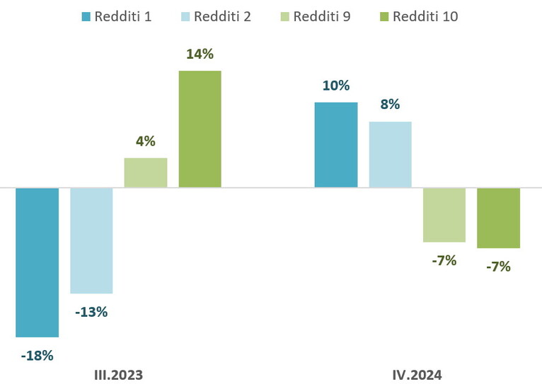 Combinando questi due elementi arriviamo a una conclusione importante: quando l’inflazione aumenta, il reddito dei settori a reddito più basso è quello più penalizzato; e, in modo analogo, quando si riduce, sono i principali beneficiari. Possiamo verificarlo nel grafico seguente. Durante il picco inflazionistico osservato nell’ultimo trimestre del 2023, i redditi dei due decili più bassi si sono ridotti, mentre quelli dei due decili più alti sono aumentati. L’opposto è avvenuto nel terzo trimestre del 2024 (ultimo dato disponibile).