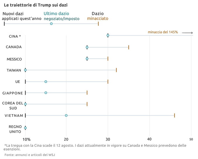 Il Wall Street Journal ha pubblicato un riepilogo della situazione attuale dei sui principali partner commerciali e settori degli Stati Uniti: "Trump ha minacciato, ad esempio, di aumentare i dazi sul Canada dal 25% al 35% se i due paesi non raggiungeranno un accordo entro venerdì. E la tregua di 90 giorni tra Stati Uniti e Cina scade a metà agosto, momento in cui i dazi di Trump sulla Cina potrebbero aumentare vertiginosamente". Secondo il quotidiano americano l'introduzione dei dazi doganali da parte del presidente Trump ha subito numerose svolte e cambiamenti dal suo lancio all'inizio di quest'anno. Ecco il grafico.