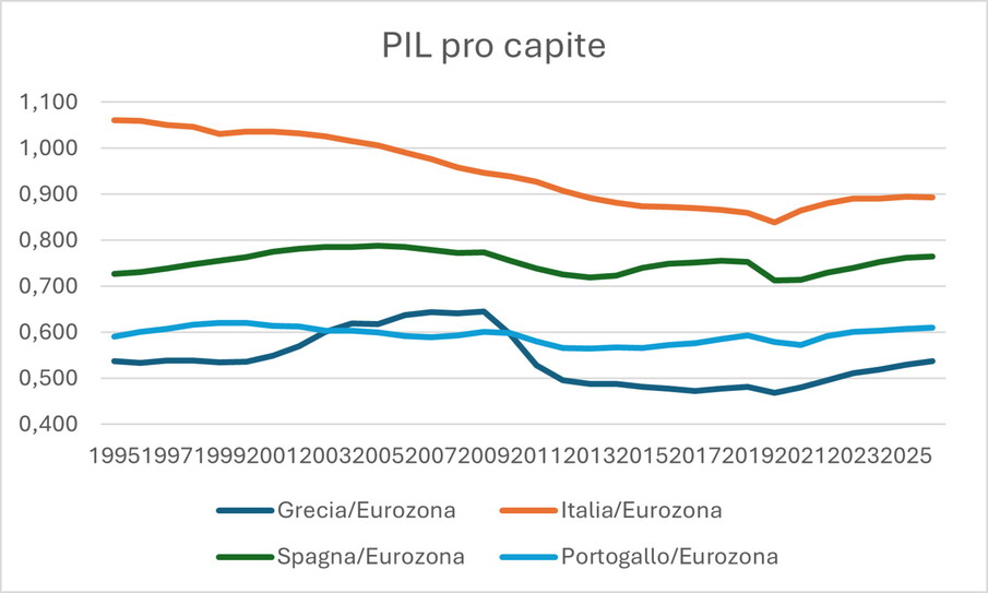 A valle della pandemia l’inversione di tendenza si sarebbe fatta sempre più visibile e netta. Nel quinquennio 2021-2025 la Grecia avrebbe recuperato – in termini di prodotto interno lordo pro capite – ben sei punti percentuali rispetto alla media dell’Eurozona. Quasi sette se si prendono per buone le previsioni della Commissione Europea per il 2026. Un risultato nettamente superiore a quelli registrati nello stesso periodo negli altri paesi della periferia meridionale dell’Eurozona. Ancora dieci punti percentuali dividono oggi la Grecia dai valori precrisi ma di questo passo l’obbiettivo appare non solo raggiungibile ma anche in tempi relativamente non lontani.