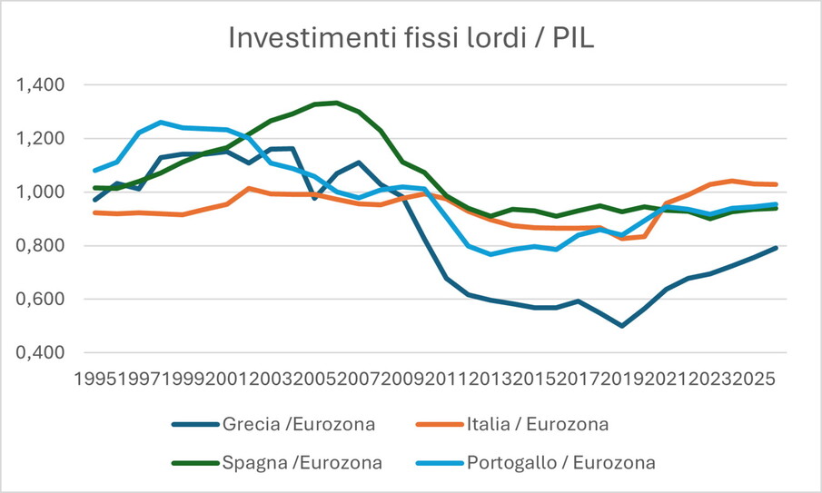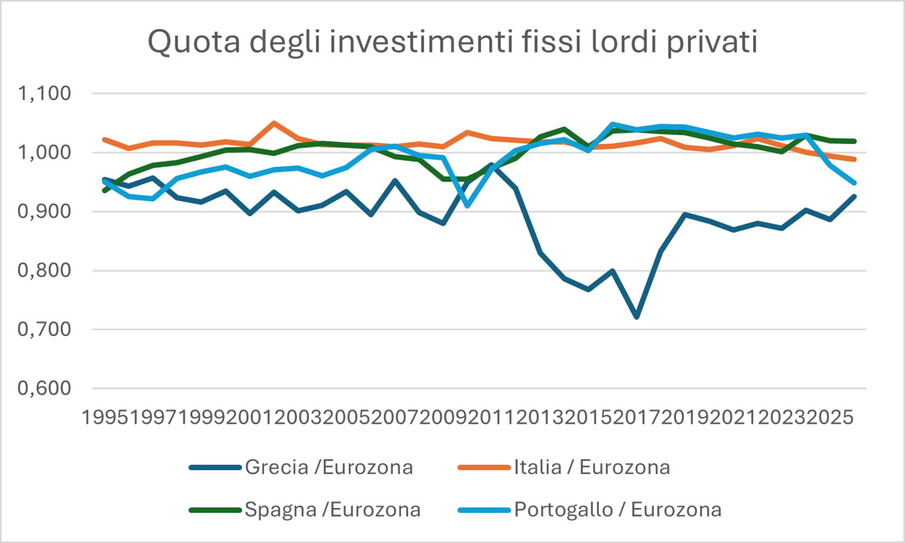 Per chiarezza: nell’imminenza della crisi finanziaria del 2008 il rapporto fra investimenti fissi lordi e prodotto interno lordo in Grecia era – e da circa un decennio - pari al 120 per cento del corrispondente rapporto osservato a livello di Eurozona. E ciò in particolare nel comparto delle costruzioni. Non sorprende, quindi, che lo stesso rapporto sia precipitato (in particolare nel comparto delle costruzioni residenziali) nel decennio successivo alla crisi fino al 60 per cento circa del valore registrato nell’Eurozona e che solo nell’ultimo quinquennio abbia mostrato segni di decisa risalita fino ad arrivare in prossimità dell’80 per cento.