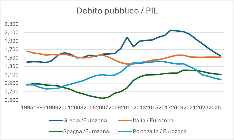 Detto in altri termini, è probabile che le configurazioni macroeconomiche dei quattro paesi della periferia meridionale dell’Unione Europea non fossero, in misura diversa, pienamente compatibili con l’adesione alla moneta unica e comunque fossero caratterizzate – anche qui in misura diversa - da squilibri non sostenibili nel medio periodo. I programmi di aggiustamento – tutt’altro che indenni da critiche - hanno contribuito in misura determinante a contenere quegli squilibri e a ripristinare una qualche compatibilità economica nelle macroeconomie che vi hanno fatto ricorso. Laddove, come in Italia, l’ipotesi di un programma di aggiustamento è stata rifiutata senza eccezioni e comunque non si è voluto – per i motivi più diversi e, per la verità e per alcuni versi, fino al 2022 – accedere all’idea di un insieme di interventi condiviso e di lungo termine, optando spesso obtorto collo per interventi a carattere per lo più emergenziale e privi di una logica complessiva, il ritorno ad un qualche equilibrio macroeconomico è stato molto più lento e con ogni probabilità socialmente più costoso.