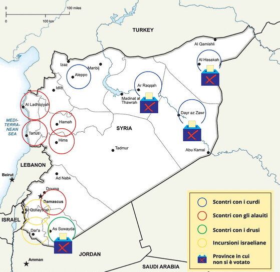 Poche ore dopo che i seggi erano stati chiusi, ad Aleppo si è cominciato a sparare. Le Forze democratiche siriane (Sdf) a guida curda si sono scontrate con quelle governative, ricordando alla Siria intera che il cammino democratico del paese è ancora tutto da scrivere. I combattimenti per le strade sono andati avanti nella notte, lasciando a terra un militare e un civile. Danni limitati da un cessate il fuoco raggiunto per sedare sul nascere l’episodio più grave avvenuto nella seconda città della Siria dalla liberazione a oggi. In tutta fretta, all’alba, un elicottero degli americani alleati dei curdi ha trasportato a Damasco il leader dell’Sdf, Mazloum Abdi, accompagnato dall’uomo di Donald Trump in Siria, Tom Barrack, che ha immediatamente organizzato un incontro con il presidente Ahmed al Sharaa e col ministro della Difesa, Murhaf Abu Qasra. Ci si è accordati affinché non ricapiti più, ma gli scricchiolii nell’intesa fra i curdi e Damasco, almeno per il momento, tendono a diventare crepe nella tenuta del fronte nord-orientale. La Siria che è alle prese con il conteggio delle schede elettorali si ritrova ancora una volta sull’orlo dell’anarchia. E basta guardarsi attorno per notare che in quasi tutte le province del paese le priorità sono altre rispetto alla pur giusta indignazione per il calo della rappresentazione femminile nella nuova Assemblea nazionale. Alcune aree geografiche semplicemente mancano all’appello nel nuovo assetto che Sharaa cerca di dare al paese. Ecco tutti i buchi neri della nuova Siria.