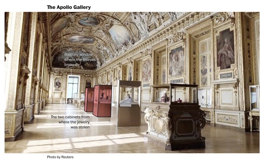 Erano circa le 9:30 di domenica mattina quando i ladri hanno compiuto un furto sfacciato al museo più visitato al mondo, sottraendo preziosi gioielli un tempo appartenuti alla famiglia reale francese. L'intero furto è durato soltanto sette minuti. Il Louvre era aperto da circa trenta minuti quando quattro ladri sono arrivati fuori dalla Galleria Apollo, in Quai François-Mitterrand, una strada che costeggia la Senna.