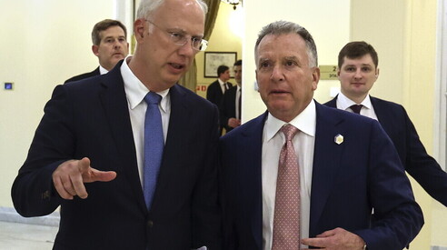 L'inviato di Putin, Kirill Dmitriev, a sinistra, e l'inviato americano, Steve Witkoff, a San Pietroburgo nell'aprile 2025 (via AP)