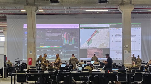 Un piano del Cmcc è dedicato unicamente ai militari israeliani, un altro a quelli americani. Il piano di mezzo, dove ci è consentito sbirciare, è quello dove si incontrano tutte le delegazioni in un enorme spazio aperto con postazioni di lavoro improvvisate. In questa torre di Babele di lingue e divise, si trova un gigante monitor con la mappa della Striscia di Gaza, dove viene monitorato il flusso dei convogli in entrata (900 nella giornata di ieri). Un alto comandante militare, con vasta esperienza in complessi scenari di guerra, sussurra che è un “modello assolutamente nuovo: tutti condividono gli stessi spazi. La collaborazione tra la componente militare e gli operatori civili è inedita”. Qui si parla di modelli per la ricostruzione, di sistema scolastico, diritto di proprietà, costituzione di “comunità sicure alternative”, di rimozione dei detriti e di bombe inesplose. Si affronta anche il tema della formazione delle Forze di polizia palestinesi, coordinata da Egitto e Giordania, in cui l’Italia potrebbe avere un ruolo, considerata l’esperienza dei carabinieri nella missione Eubam al valico di Rafah.