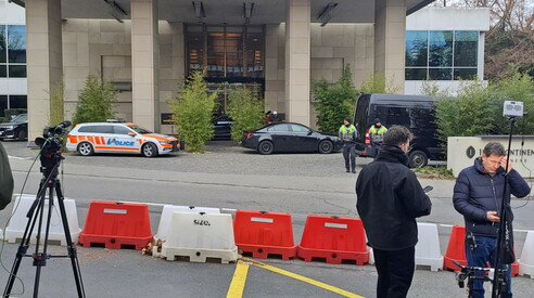 Dispositivi di sicurezza e giornalisti all'esterno della struttura che ospita il vertice sull'Ucraina a Ginevra (ANSA / SILVIA GASPARETTO)