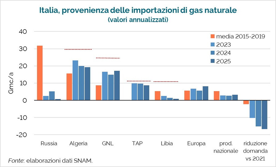 Lo sforzo dell'Italia per affrancarsi dalla Russia è stato importante. Come si nota da quest'altro grafico, dal 2023 a oggi il nostro paese ha via via aumentato le quote fornite dall'Algeria, ma anche l'Azerbaigian tramite il Tap. Il Gnl arriva invece da Qatar, Stati Uniti e altri paesi più marginali.