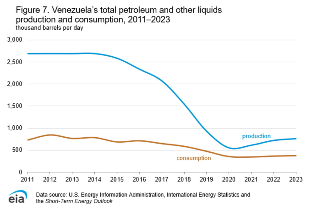 Dai dati di Portal energètico, emerge che nel paese ci siano almeno 148 aree di estrazione oil & gas. A livello di produzione, il picco massimo si è toccato negli anni Novanta, intorno ai 3–3,5 milioni di barili al giorno. Tuttavia, come si vede in questo grafico, dopo decenni di mala gestione, corruzione e sanzioni internazionali, la produzione è drasticamente crollata, arrivando nel 2024 a contare circa 900 mila barili giornalieri.