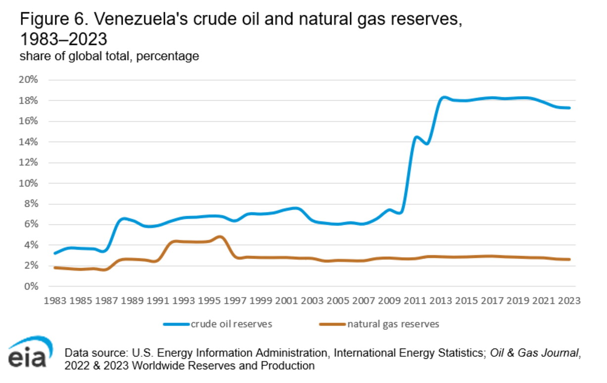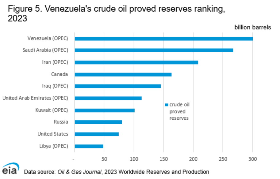 Come calcolato dalla U.s. Energy Information Administration (Eia), nel 2023 il Venezuela ha prodotto lo 0,8 per cento del petrolio greggio mondiale. Ma più che nella produzione (ricordiamo, in costante diminuzione) il vero primato di Caracas è nelle riserve. Come si vede nell'immagine, sempre nel 2023 il Venezuela possedeva le maggiori riserve accertate di petrolio greggio al mondo, pari a circa 303 miliardi di barili. Vale a dire quasi il 17 per cento delle riserve globali, più dell’Arabia Saudita e oltre il triplo della Russia o degli Stati Uniti. La maggior parte delle riserve accertate di petrolio greggio del paese è costituita da petrolio greggio extra-pesante proveniente dalla cintura dell'Orinoco.
