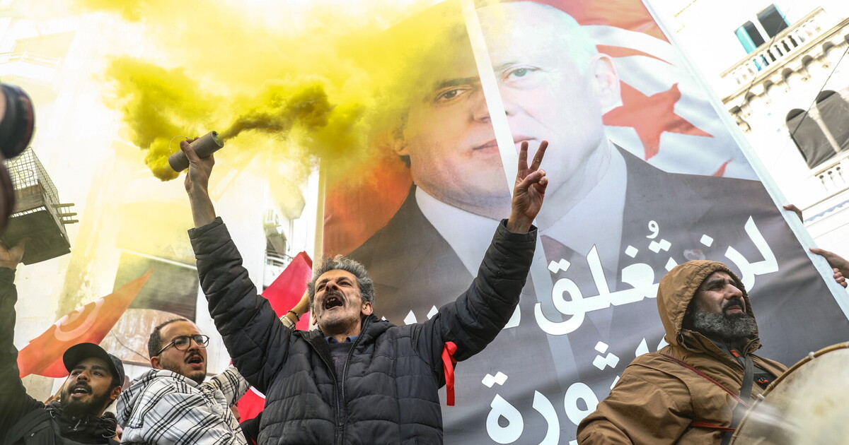 Una manifestazione aTunisi contro Saied, con un manifesto che compara il presidente tunisino all'ex dittatore Ben Ali (foto Getty)