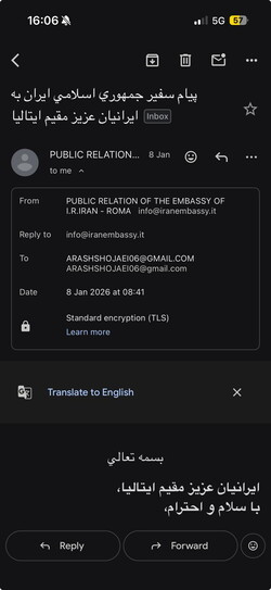“Nel Nome di Dio, l’Altissimo. Cari cittadini iraniani residenti in Italia, con saluti cordiali e profondo rispetto, oggi più che mai, la storia ci chiede da che parte stiamo di fronte alla verità̀. Da anni il nostro popolo è bersaglio di pressioni, sanzioni e minacce manifeste e occulte da parte di potenze che antepongono i propri interessi al diritto alla sovranità̀ delle nazioni: gli Stati Uniti e il regime sionista che, attraverso politiche interventiste, guerre di narrazione e pressioni economiche, hanno preso di mira non solo l’Iran, ma anche altri Paesi”. Inizia così la mail inviata alle 8,41 dell’8 gennaio, quando il regime ha imposto il blackout digitale per preparare la strage dei manifestanti, a Tina Karam e Arash Shojaei: una coppia di attivisti, ingegnera lei, architetto lui, arrivata in Italia per studiare all’università. Oggetto della mail, firmata dall’ambasciatore della Repubblica Islamica dell’Iran in Italia, Mohammad Reza Sabouri, convocato ieri dal ministro degli Esteri Antonio Tajani alla Farnesina per esprimere disappunto contro le violenze che da giorni stanno insanguinando il Paese: “messaggio dell’ambasciatore della Repubblica Islamica dell’Iran ai cari connazionali residenti in Italia”.