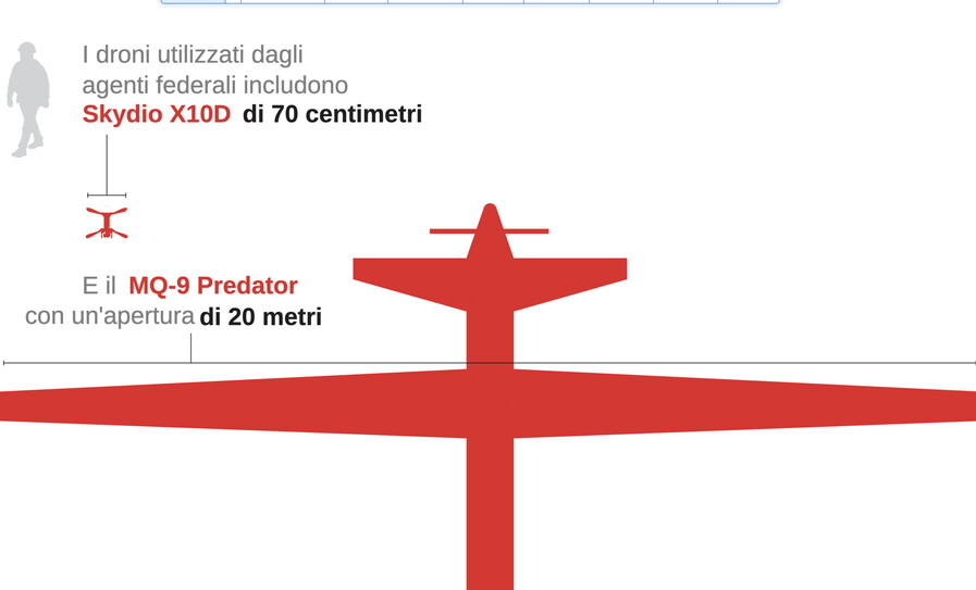 I droni sono sempre più presenti nelle operazioni sul campo delle forze dell'ordine federali, fornendo video aerei in tempo reale alla base. Un modello compatto acquistato dall'Ice, lo Skydio X10D, è pubblicizzato come in grado di rilevare individui da una distanza di 7,5 miglia e di identificarli da una distanza di 0,8 miglia. Molti modelli sono dotati di visori notturni e termocamere. Skydio non ha risposto alla richiesta di commento. L'Ice ha utilizzato piccoli droni per monitorare alcune proteste nel corso dell'ultimo anno. La sua agenzia gemella, la U.S. Customs and Border Protection, ha anche fatto volare un MQ-9 Predator di dimensioni molto più grandi e di livello militare sopra le proteste anti Ice a Los Angeles durante l'estate. Sebbene non sia chiaro quali tecnologie fossero a bordo di quel drone, l'aeronautica militare statunitense ha precedentemente rivelato di aver equipaggiato alcuni MQ-9 Predator prodotti da General Atomics con un sistema “Gorgon Stare” composto da centinaia di telecamere in grado di tracciare tutto ciò che si muove su un'area di 40 miglia quadrate in alta definizione.