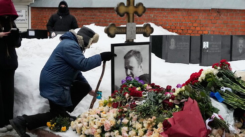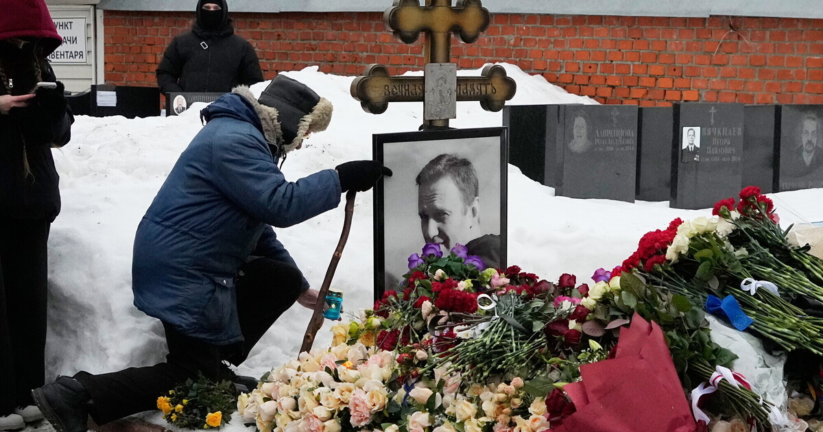 Sulla tomba di Navalny, a due anni dalla sua morte, nel cimitero Borisovskoye di Mosca (AP Photo/Alexander Zemlianichenko)