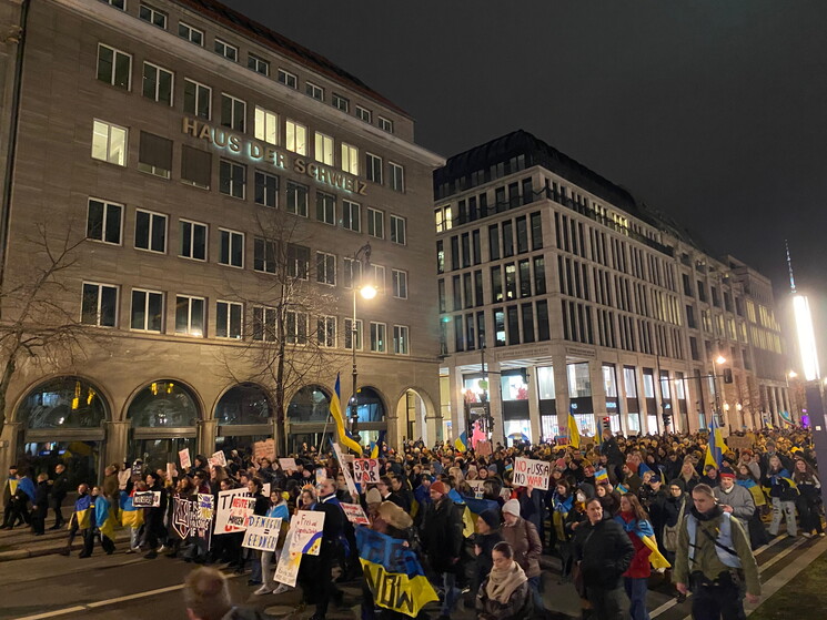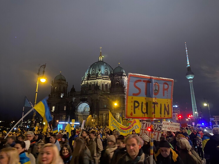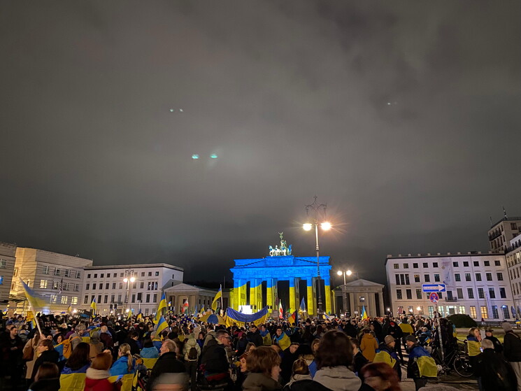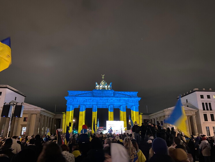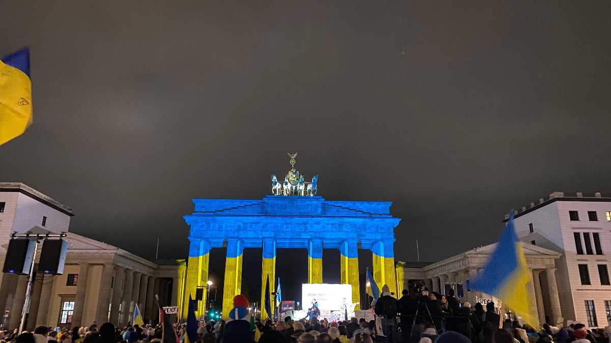 "La differenza tra me e un soldato russo è che io sono a casa mia, io ho ragione. Io combatto per il mio Paese, dentro il mio Paese, per me si tratta di proteggere la mia famiglia e i miei amici". Oleh è di Charkiv, ha 29 anni, di mestiere faceva l'educatore, ma da tempo è arruolato nella fanteria ucraina. Per qualche giorno ha lasciato il fronte ed è venuto in visita a Berlino, dove ieri sera si è unito a migliaia di manifestanti sotto alla Porta di Brandeburgo, illuminata appositamente con il giallo-blu della bandiera ucraina. Gli stessi colori sventolati nella folla da giovani e anziani, tedeschi e ucraini. Ci sono anche diverse bandiere georgiane, bandiere Ue e qualche simbolo della dissidenza iraniana. "La Russia è uno stato terrorista", "Basta scuse, ora armi a lungo raggio", "Dateci i Taurus", intonano i manifestanti, che per arrivare alla Porta hanno sfilato proprio davanti all'imponente Ambasciata russa che si trova lungo Unter den Linden.