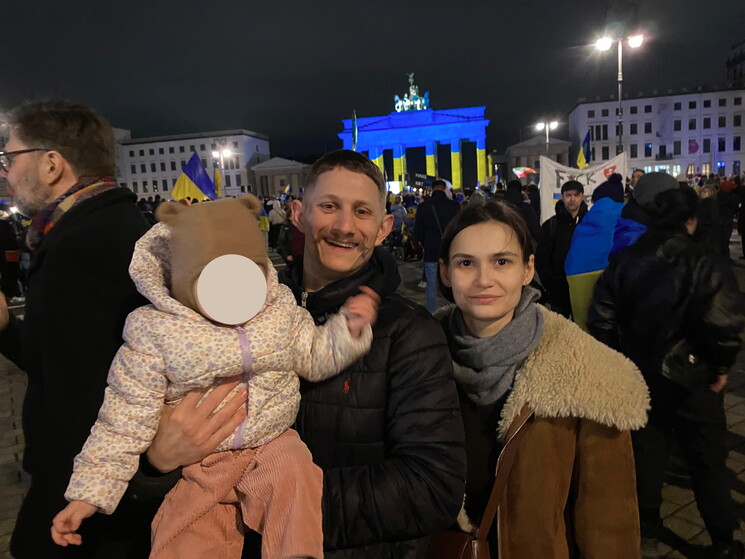 Nella piazza c'è anche Oleg Degusarov, 31 anni, che l'altro ieri ha partecipato all'apertura, in un bunker-museo berlinese, di un'esposizione dedicata agli attacchi con droni di Mosca. Nella mostra c'è anche il furgone di Oleg, devastato a Cherson da un drone russo, mentre lui e un suo amico viaggiavano come volontari civili in assistenza alla popolazione. L'amico è stato ucciso, Oleg è rimasto ferito, il suo amico è stato ucciso. Il 31enne ucraino è a Berlino con la moglie Alina e la figlia, ma fra pochi giorni torneranno tutti in patria. "Tutto quello che facciamo, lo facciamo per lei. Tutto, amico mio", mi dice Oleg, tenendo in braccio la bambina. La piccola ha un anno e quattro mesi, il suo nome è Solomia, che significa "pace".