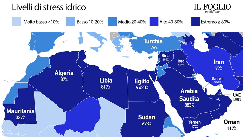 Per capire la posta in gioco, bisogna prima capire dove si colloca il medio oriente nella mappa globale della scarsità d'acqua. Secondo UN-Water (il meccanismo interagenzia delle Nazioni Unite che si occupa di questioni idriche), 2,3 miliardi di persone, una su quattro nel mondo, vivono in paesi ad alto stress idrico. Come mostra la mappa qui sotto, sette dei dieci paesi più a rischio si trovano nella regione mediorientale e nordafricana: lì il livello medio di stress idrico è dell'820 per cento, il che significa che ogni anno si preleva otto volte più acqua di quanta ne venga prodotta dalle risorse rinnovabili.