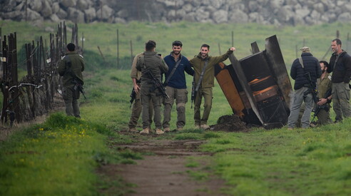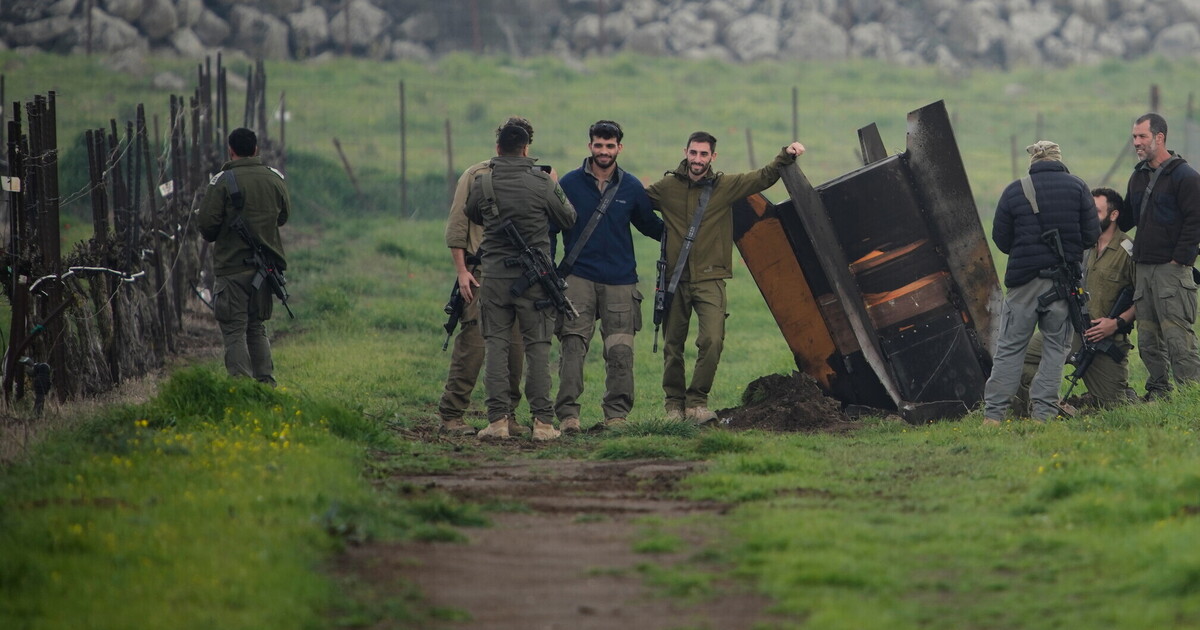 Soldati israeliani accanto a un frammento di missile lanciato dall'Iran e intercettato sulle alture del Golan (AP Photo/Ohad Zwigenberg)