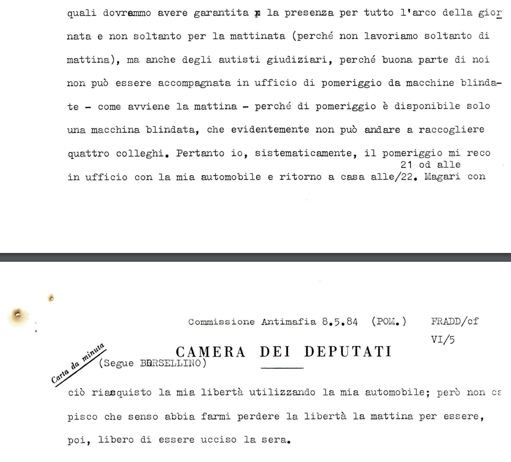 Oggi, per la prima volta, sono stati diffusi gli audio e le trascrizioni delle audizioni del giudice Paolo Borsellino tra il 1984 e il 1991. Nella prima, datata 8 e 9 maggio 1984, il magistrato, all'epoca giudice istruttore a Palermo, parla della propria sicurezza personale e del problema della gestione delle scorte. “Dovremmo avere garantita la presenza per tutto l'arco della giornata degli autisti giudiziari – spiega Borsellino (nella foto sotto il verbale) – perché buona parte di noi non può essere accompagnata in ufficio di pomeriggio da macchine blindate – come avviene la mattina – perché di pomeriggio è disponibile solo una macchina blindata, che evidentemente non può andare a raccogliere quattro colleghi. Pertanto io, sistematicamente, il pomeriggio mi reco alle 21 in ufficio con la mia automobile e ritorno a casa alle 22. Magari con ciò riacquisto la mia libertà utilizzando la mia automobile; però non capisco che senso abbia farmi perdere la libertà la mattina per essere, poi, libero di essere ucciso la sera”.