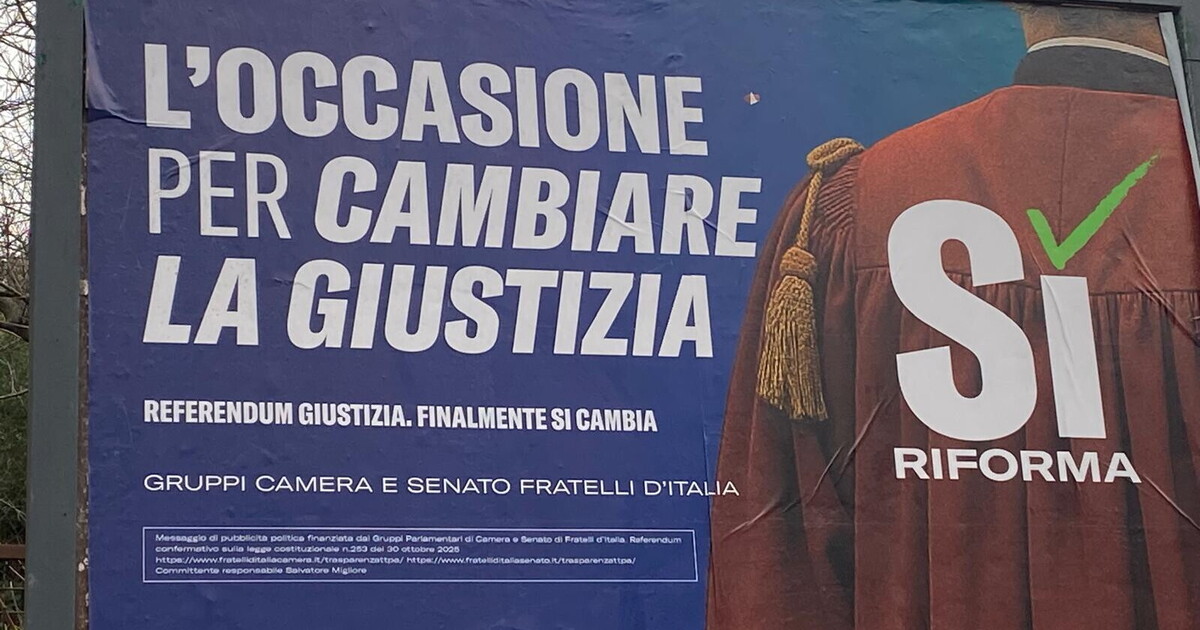 "L'occasione per cambiare la giustizia". Così recita il cartellone a sostegno del Sì per il referendum sulla giustizia a cura di Fratelli d'Italia. Qualche particolare fa capire la postura con la quale i partiti si stanno avvicinando alle prossime settimane, quando lo scontro sarà più duro e serrato. La premier Giorgia Meloni è stata attenta fin dall'inizio a non voler politicizzare il voto per la riforma Nordio, evitando di legare le sorti del suo governo a quello del voto del 22 e 23 marzo. Una scelta che viene plasticamente rappresentanta e supportata dall'assenza del simbolo del suo partito dal cartellone, attribuibile ai meloniani solo per la firma quasi a piè di pagina, piccola e non grassettata: "gruppi camera e senato Fratelli d'Italia". Non solo, non c'è alcun tipo di riferimento alla stessa presidente del consiglio, ma il logo (gigante) del comitato "Sì riforma", sovrapposto a un'immagine di un magistrato girato di spalle.