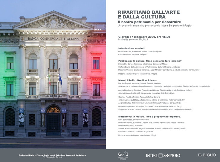 Ripartiamo dall'arte e dalla cultura. Il nostro patrimonio per ricostruire. Un evento in streaming promosso da Intesa Sanpaolo e Il Foglio, giovedì 17 dicembre alle 15 qui e sulla pagina Facebook del Foglio