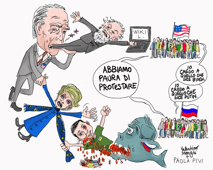 Il disegno digitale di Paola Pivi e Valentino Menghi e quello di Diego Perrone: l'occupazione dell'Ucraina e la strategia di Putin visti con gli occhi dell'arte