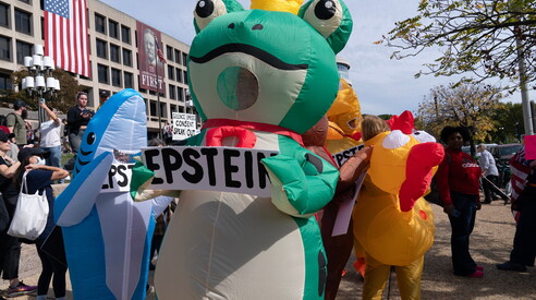 Due fotografie dai coloratissimi cortei No Kings che ho trovato affiancate in una delle tante gallerie sui siti d’informazione americani. Nella prima si vede un cartello con la sagoma di una corona obliterata da una croce rossa, il simbolo più diffuso delle proteste dei giorni scorsi; la seconda mostra invece un manifestante con la maschera di Pennywise, il pagliaccio maligno tutto denti di It di Stephen King, che regge un altro cartello con la scritta “Clowns killing democracy” marchiata da una croce nera. No al re, no al buffone. Abbasso la corona, abbasso il berretto a sonagli. L’accoppiamento è senz’altro giudizioso, e mostra nel modo più icastico possibile lo scacco matto che Donald Trump ha fatto a tutti.