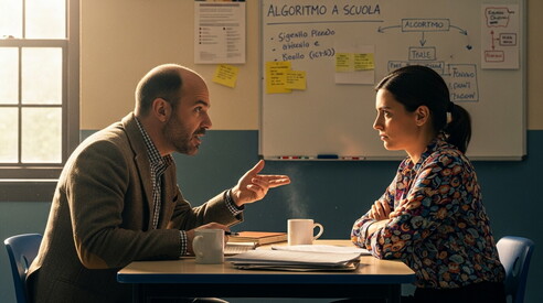 E così si allontanano, due personaggi mai esistiti, creati solo per simulare un dubbio che attraversa molte scuole reali: come insegnare a restare umani, in un tempo in cui le macchine scrivono, leggono e rispondono più in fretta di noi. In fondo, anche loro stanno ancora imparando. Non solo a usare l’AI, ma a capirsi a vicenda, come se questa conversazione servisse più a loro che agli studenti.