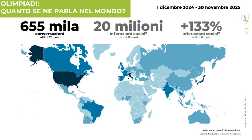 Anche a livello mondiale monta l'interesse per i giochi Olimpici invernali, trainati in particolare dal dibattito social negli Stati Uniti. Nel mondo, negli ultimi mesi ci sono state 20 milioni di interazioni, con una crescita del 133 per cento negli ultimi 6 mesi. "A dare ulteriore impulso alla dimensione internazionale interviene anche Dua Lipa, popstar da oltre 130 milioni di follower, i cui contenuti sulle prossime Olimpiadi per la rete americana NBC hanno sfiorato i 2 milioni di interazioni", spiega SocialCom "La sua narrazione glamour di Milano come capitale della moda proietta Milano-Cortina nel flusso della cultura pop globale, ampliando enormemente la visibilità dell’evento"