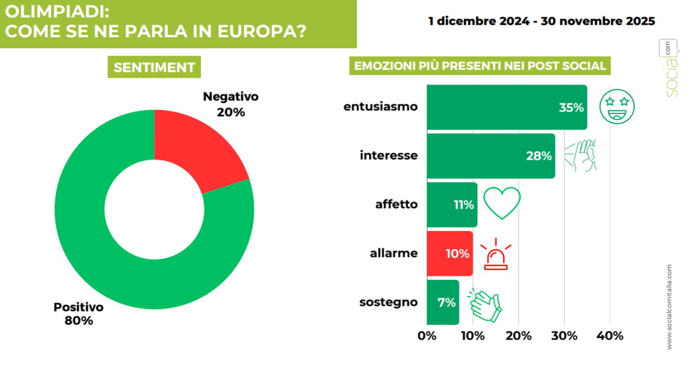 Nel frattempo a livello social cresce l'interesse per le olimpiadi, non solo in Italia ma anche in Europa e nel mondo. La ricerca condotta da SocialCom, che nell'ultimo anno ha analizzato oltre 200 mila contenuti, rileva infatti "una centralità sempre più marcata dell'evento nel dibattito pubblico e digitale", con toni in larghissima parte positivi.
