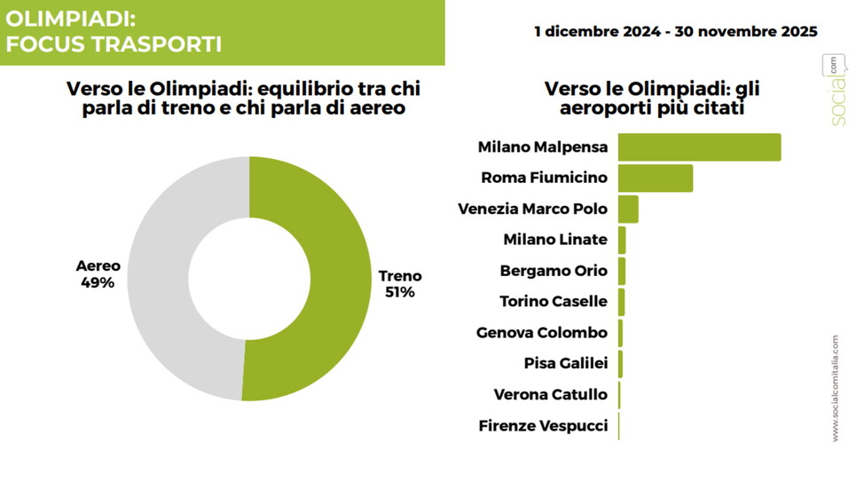 Il report di SocialCom dedica anche un approfondimento legato ai trasporti: gli aeroporti di Milano Malpensa e quello di Fiumicino nella Capitale sono gli scali più citati quando si parla di Olimpiadi. Più in generale, riguardo al mezzo di trasporto attraverso cui raggiungere gli eventi, "la conversazione è divisa in modo quasi perfetto tra treno (51 per cento) e aereo (49 per cento).