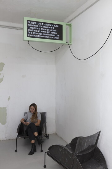 Riccardo Benassi, Daily Desiderio Domestico, 2019 — ongoing, display a LED, CPU, modem Wi-Fi, carter metallico RAL 6019 opaco, software, 115,8 x 48,6 x 12,9 cm, installation view presso Fondazione ICA, Milano, Courtesy Fondazione ICA, Milano, Foto © Andrea Rossetti
