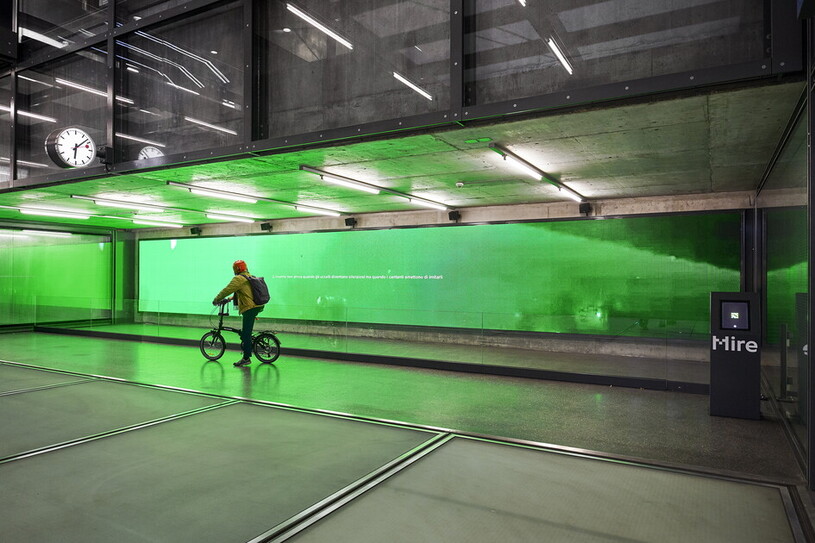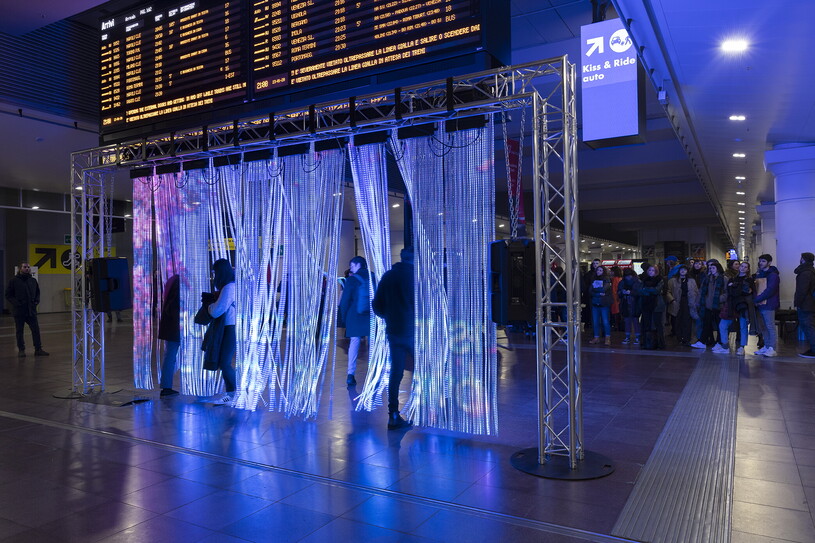 Riccardo Benassi, Morestalgia, 2019, schermo LED penetrabile dal corpo umano, contenuto audiovisivo, installation view presso Hall Alta Velocità Trenitalia - Bologna Centrale nel contesto di Live Arts Week 2020, prodotto da Xing con il sostegno di Italian Council (V Edizione), partners Centre d’Art Contemporain Genève, Italian Cultural Institute of Melbourne, ZKM | Zentrum für Kunst und Medien, Karlsruhe, Künstlerhaus Bethanien, Berlin, Collezione Museion, Bolzano, Courtesy Collezione Museion, Foto © Andrea Rossetti
