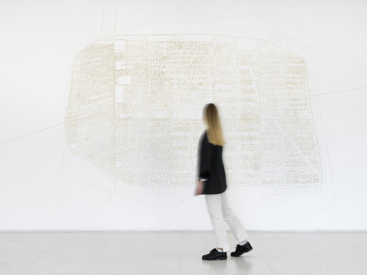 La planimetria del campo di Za’atari è riprodotta sul muro attraverso un ricalco realizzato utilizzando come pigmento la terra prelevata nel governatorato di Mafraq, Giordania.