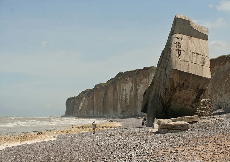 Il bunker, costruito senza fondamenta e in una unica colata, a seguito del processo erosivo si è distaccato dalla scogliera conficcandosi nella sabbia.