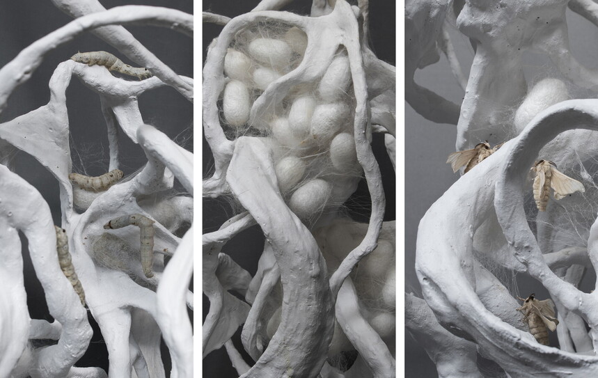 Il mio studio è all’interno di un’azienda, un ricamificio tessile che mio padre aprì più di 35 anni fa e ancora oggi perfettamente funzionante. Le dinamiche all’interno di quello spazio sono quindi pura coesistenza bilanciata tra clienti dell’azienda, curatori, amici o collezionisti in visita, produzioni di capi d’abbigliamento, corrieri, trasportatori d’arte, corpi scultorei che nascono e girano per lo spazio, oggetti e materiali in rovina riposti in scatole o contenitori, piante, ogni tanto bachi da seta… potrei continuare, ma penso di essere riuscita a fornire un’immagine più o meno chiara del luogo.