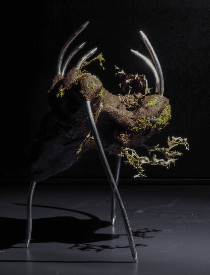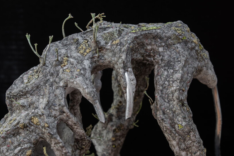 Riferimenti visivi sono molteplici e di varia provenienza. Dalla scienza, al bio-design, all’arte antica… sono abituata a raccogliere tracce, ispirazioni, forme per poi convogliarle in opere dove tutto contribuisce alla creazione di un corpo altro. Giusto per riportare un esempio pratico introduco un progetto a cui sto lavorando in collaborazione con l’Istituto di Biologia dell’Università di Graz nato dalla fascinazione che ho avuto per gli organismi compositi, gli olobionti e nello specifico i licheni. Essi sono il risultato della simbiosi tra due organismi: un’alga e un fungo. Ciò che noi riconosciamo come lichene, è la struttura estetica di come appare l’organismo come se fosse l’architettura che il fungo costruisce attorno all’alga, racchiusa all’interno. Questa costruzione funzionale che attua il fungo mi ha fornito l’ispirazione sia teorica che pratica per iniziare il progetto Blended Matter.