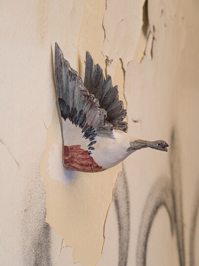 A seconda di quando mi fanno questa domanda rispondo sempre con l’ultimo lavoro che ho fatto, in questo caso è Fortune’s always hiding, I’ve looked everywhere. Una serie di uccellini di ceramica dipinta con la testa infilata nel muro, che è in mostra alla nona edizione della Biennale Gherdëina insieme a un altro lavoro intitolato Il cielo è dei violenti (fino al 1 settembre). Sono molto legata al primo lavoro della mia carriera, che ho esposto in Pirelli Hangar Bicocca a inizio 2018, Pensiero stupendo (self-portrait).
