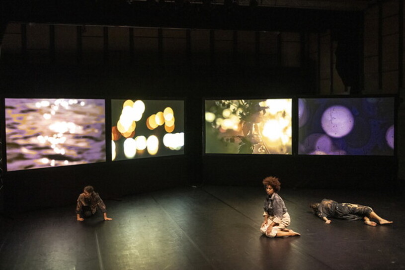 Installazione multimediale a 4 canali, video in sincro, performance con 3 performer