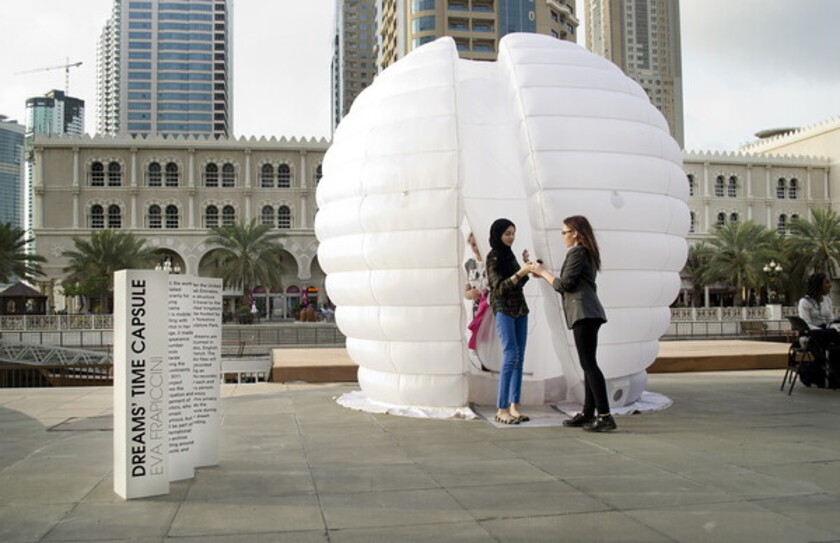 Dreams Archive è il titolo “umbrella” che raccoglie tre differenti installazioni e una serie fotografica: il progetto itinerante Dreams’ Time Capsule (2011-2022), l’opera multimediale a quattro schermi e performance Dust of Dreams (2022), e l’installazione sonora Dreamscape (2023). Dreams Archive è anche il titolo della pubblicazione edita da bruno, che raccoglie la storia e le mostre realizzate fino al 2023 di questo progetto decennale. Dreams’ Time Capsule è iniziato nel 2011, ed è un evento partecipativo realizzato con una capsula gonfiabile, che viaggiava nella mia valigia, in piazze, musei, spazi non profit di varie città del mondo. All’interno di questa struttura che ho ideato con il designer Michele Tavano e grazie al supporto economico di ArkDes Stoccolma, si sono sedute circa 2380 persone per registrare il racconto di un sogno, lasciando i contatti e-mail per ricevere le registrazioni sonore a distanza di 10 anni. Dreams’ Time Capsule è un progetto che finirà nel 2032, e quindi è in costante rapporto con il tempo e le trasformazioni personali e collettive. Ha attraversato le elezioni post-primavera araba dopo 30 anni di dittatura in Egitto, nel 2012; lo shock della Brexit, due settimane dopo il voto nello Yorkshire; la guerra in Siria nei sogni dei profughi a Dubai nel 2016. La natura relazionale di questo lavoro si è riflettuta anche nel coinvolgimento di curatrici e curatori, psicologhe e psicologi, antropologhe e antropologi, filosofe e filosofi che ho incontrato in Colombia, negli Emirati, Egitto, Svezia, Lettonia, ecc…
