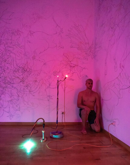 Umberto Chiodi, Moonbow - Over the rainbow (con Matteo Levaggi), azione performativa, installazione e disegni parietali, Osservatorio Futura, Torino 2021