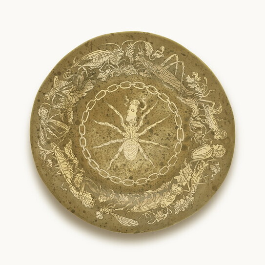 Umberto Chiodi, Piatto del prigioniero (Ragno e insetti), incisione all'acquaforte su ottone, diam. 28 cm, 2020